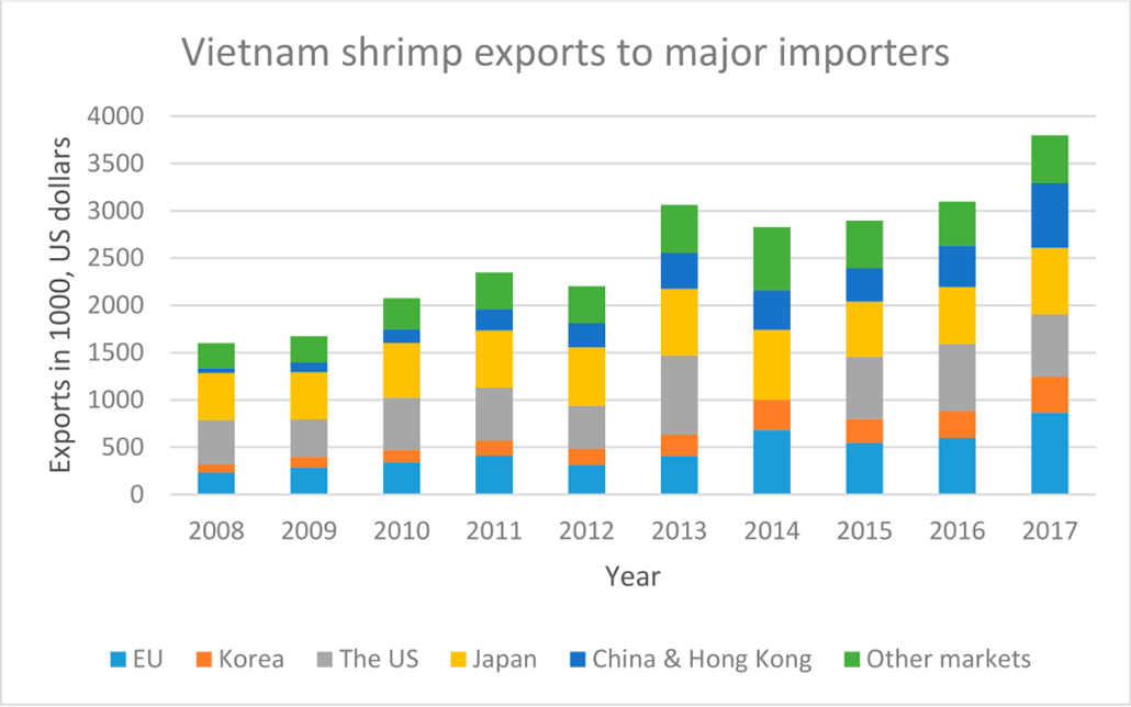 Shrimp production is responsible for a large part of Vietnam's seafood exports to the EU, US and Asian countries. Its market share to the EU has increased from 30.87% in 2011 to 46.64% in 2015 (Figure 3). The total shrimp exports to the rest of the world have also increased accordingly. From 2009 to 2011, the export value of shrimp increased positively from 4.5% to 24.2% [ 13 ]. Shrimp has been the biggest export product, accounting for 37% to 51% of total animal-based aquatic food exports, followed by pangasius (23% to 31%) [ 14 ]. In 2012, shrimp exports decreased by 6.6% due to early mortality syndrome (EMS), also called Acute Hepato-Pancreatic Necrosis Syndrome, that reduced production. In 2013, for the first time in history, Vietnam's shrimp exports hit over US$3 billion. A decrease in the global shrimp supply due to EMS, a rise in the global shrimp price, an increase in the demand for whiteleg shrimp and higher output of Vietnam whiteleg shrimp in 2013 were the main factors that helped Vietnam attain this target. In 2014, shrimp exports followed the upward momentum in 2013 with the growth of 26.9% to reach a peak of US $3.95 billion. Over 10 years (2008–2017), the export value of Vietnam shrimp recorded a remarkable growth rate of 137%. In 2017, the area and output of farmed shrimp reached the highest levels ever (Figure 1). The fluctuation of shrimp exports to the EU also raised a concern of sustainability for previous sector target [ 15 ]. In this paper, the sustainability of whiteleg shrimp production and marketing in Vietnam is evaluated as producers attempt to increase yield per ha to meet government targeted levels of exports.