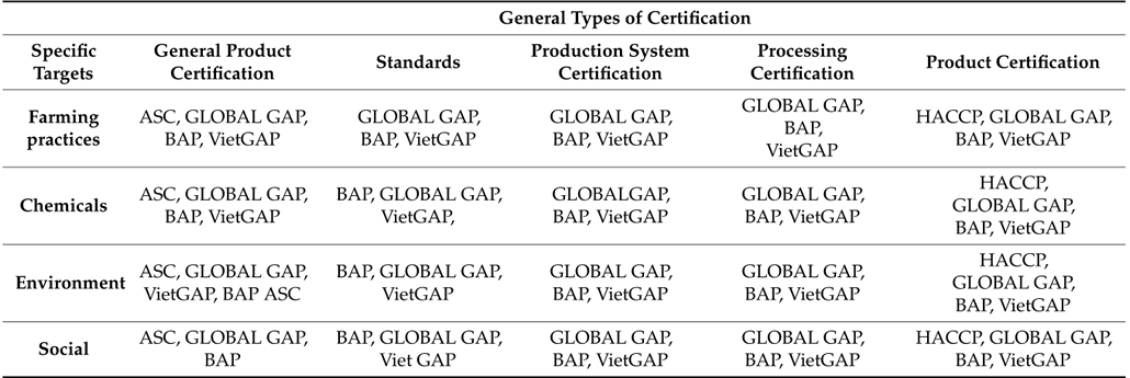 The number of standards seen in Table 1 is overwhelming for a small-scale farmer to handle. The shrimp industry in Vietnam responds to international consumers' demands, and therefore, it is buyer driven. Buyers' demands place pressure on processors and farmers to increase international food safety, quality and sustainability standards, and certification schemes. In the past 15 years, Vietnamese shrimp have been subjected to a series of food safety standards from the EU and US related to all stages of the supply chain "from pond to plate" that apply to quality, labor, and the environment. There are numerous standards imposed by various organizations that affect all aspects and actors operating along the shrimp value chain, but the most applicable standards for Vietnamese shrimp are Global Good Agricultural Practices, Best Aquaculture Practices, Safe Quality Food and Aquaculture Stewardship Council, (Global GAP, BAP, SQF, and ASC) (Table 1). Most of these standards affect all stages of the value chain and even the environmental and social aspects. However, Global GAP, BAP, and ASC include requirements for environmental protection (Table 1).